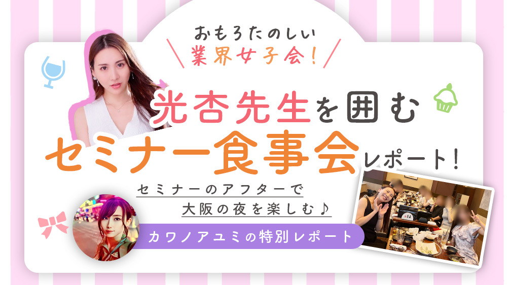 セミナー終了後には、参加者たちと光杏先生を囲む食事会が開催されました。食事会には今回セミナーに参加した約20名以上の関西を中心とした各店舗の風俗嬢が集まり、和気あいあいとした雰囲気の中でスタートしました。