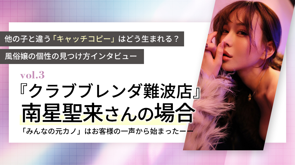 第3回目に登場してくださったのは、現在大阪・難波の『クラブブレンダ』に在籍し、シティヘヴンの投票イベント「ミスヘヴン」で全国2位という実績を作った有名嬢・南星聖来さん。そんな彼女のキャッチコピーは「みんなの元カノ」です。