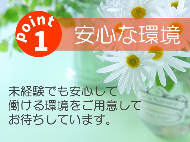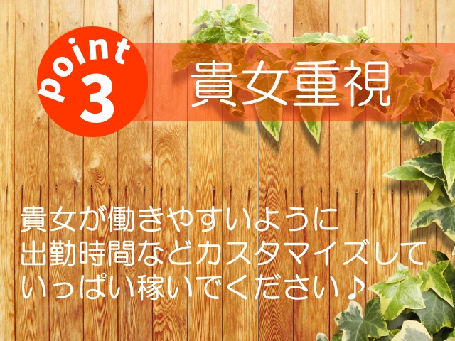 初心者歓迎、アリバイ対策、日払い可、体験入店可、最低保証有、自由出勤制、交通費支給、罰金・ノルマなし、寮完備、個室待機、各種ボーナス有、衣装貸与、託児所有、店泊OK、出張面接OK、週1・月1出勤OK