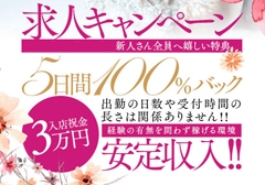 入店祝金3万円プレゼント 新人さん全員へプレゼントしております!難しい条件なし! 入店5日間は100%バック 求人キャンペーン実施中! ガッツリ稼げるこの機会にぜひご応募ください。 |