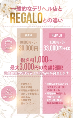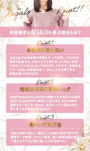 未経験の方『大歓迎』です♪ 現在REGALOでは、業界経験ゼロからの女の子も多数活躍してくれてます。 サービス内容や接客マナーについては、口頭にてご説明しております。 俗にいう変態講習は、一度たりとも行なったことはありません。 講習用の動画もありますし、元キャスト経験者の女性スタッフもおりますので、 希望の子はお姉さん達と講習してもいいかもしれませんね♪