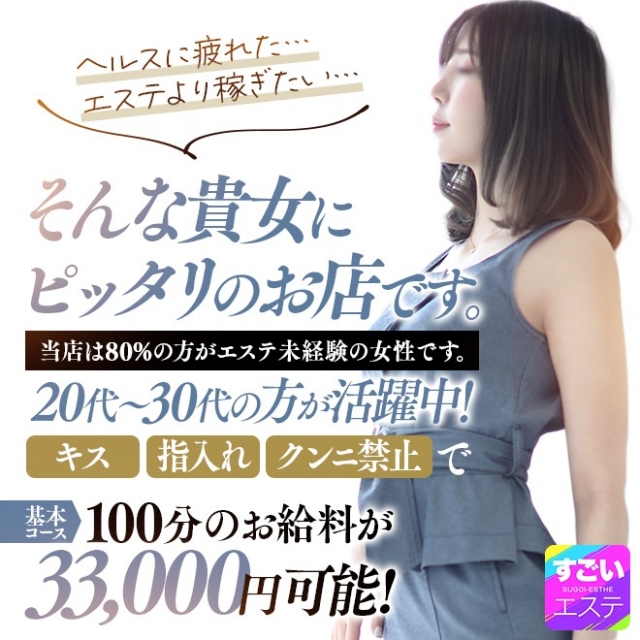 女性が体を酷使せずに稼げる風俗店を守り続ける「スターグループ」だからこその女性求人特典を是非実感して下さい! ●【スターグループのおすすめポイント4選】 1、キスや口内発射など粘膜接触なしで高級ヘルス以上のバック率! 2、他店から移籍の場合はその在籍店の給与をそのままスライド可能! 3、一般エステの資格取得可能! 4、ご友人紹介で5万円お給料と別に支給♪ あなたは今の収入で満足されていますか? すごいエステは【今よりもっと稼ぎたい】を実現できるお店です。 今までのあなたの努力や成果を活かし、1本のバックはあなた自身で決めてください。 ◆すごいエステは未経験者からでも相場の1.5倍のお給料からスタートです◆ 60分でのお給料13000円スタート~最大25000円までUPします!!独自のランク制度があり、頑張った分がそのままお給料に反映されます ◆身体を守りながら稼げるお店◆ すごいエステの最も重要なポイントは、そのお仕事内容です。 キス、指入れ(局部のお触り)、口内発射は禁止行為としておりますので、身体への負担がとても少ないです。 未経験の方はもちろん、経験のある方はなおさら魅力的なお仕事内容になっています。 「下のお触りが無いから、仕事が楽しくなった!!」 「内容はソフトになって、お給料が上がるなんて嬉しい」 「体への負担がないから、前より出勤を増やせるようになった」 「前のお店と比べて、優しいお客様が多くて仕事がしやすい」 すごいエステに入店された女性全員から、このようなお声を沢山頂いております。 また、当店はお給料だけでなく、会員様のほとんどが紳士な優しいお客様なので、「客質がイイ」と好評を頂いております。 是非一度、当店の働きやすさを体感してください(^^) お問い合わせお待ちしております! |