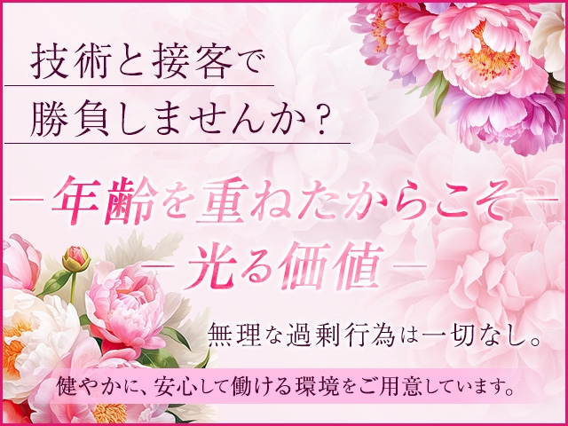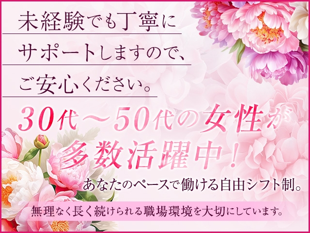 年齢を重ねた女性ならではの「落ち着き」や「思いやり」を大切にしています。 経験よりも人柄重視の採用ですので、未経験の方も安心してご応募ください。 年齢を理由にあきらめる必要はありません。あなたの魅力を活かせる場所がここにあります。 |