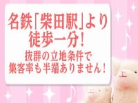 愛知県名古屋市南区の南端、名鉄常滑線の柴田駅から歩いて1分。国道247号線、柴田本通3交差点の目の前が勤務地。周辺はファッションヘルスと熟女キャバクラ、キャンパスパブと昔ながらのキャバレーなど、名古屋市南区の一大歓楽街。名古屋の中心部で働くとバレそうだから避けたい、でも郊外すぎると稼げそうにない。中間くらいのちょうどいいところがないかなぁと思っている女の子におすすめ。ただし、柴田はおそらく誰もが想像している以上に風俗バイトで稼げます。考えていることは男性も一緒。名古屋のど真ん中だと風俗に通っているってバレちゃいそうだし、名古屋から遠いと遊びに行くのも大変。都合よく遊びに行けそうなところがないかなぁと思っている男性がたくさん遊んでいるのが柴田だからです。