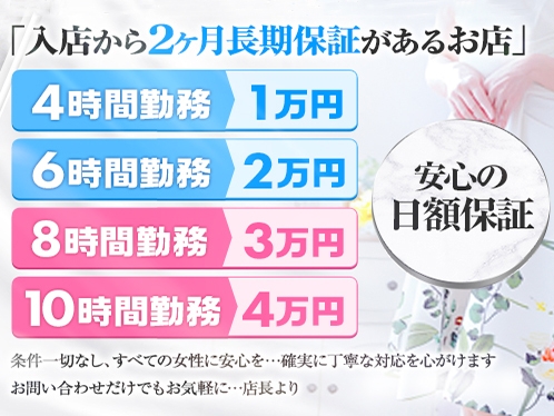 2ヶ月間の保証はトータル保証ではなく、日給保証です!2ヶ月間は1日最大4万円まで完全日払いの日給保証!写メ日記や出勤日数などその他条件一切なし!1日4時間待機~採用女性全員に適応されます♪